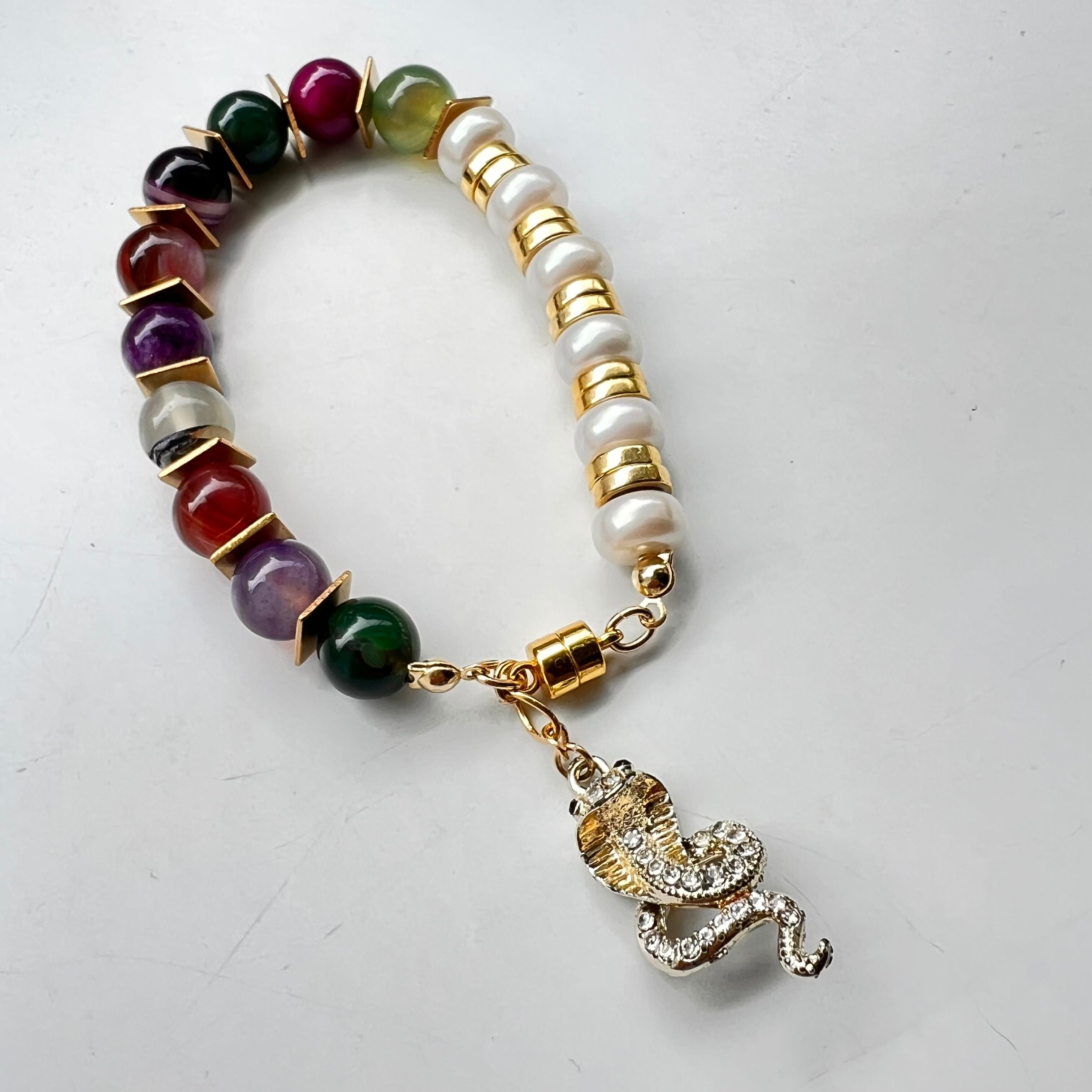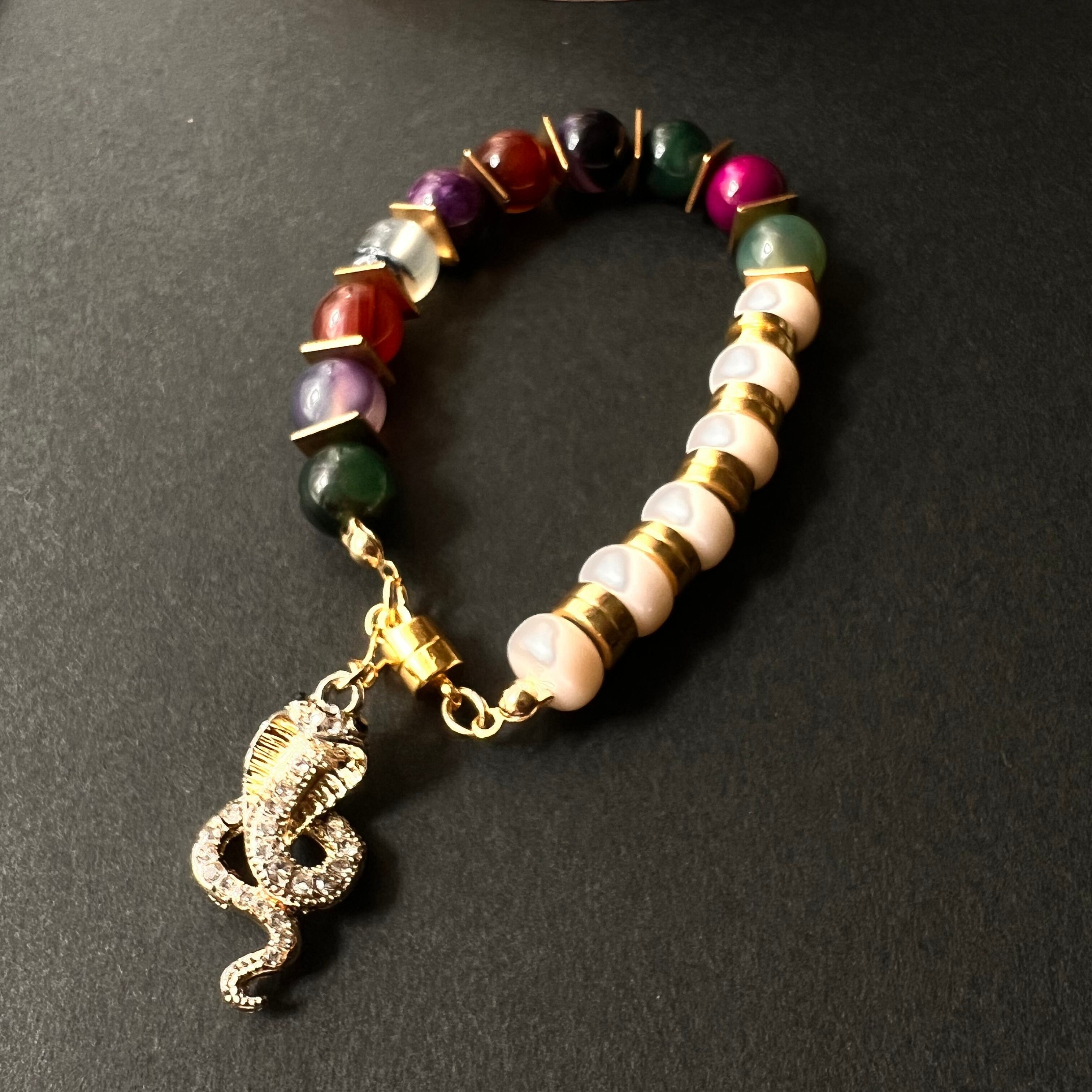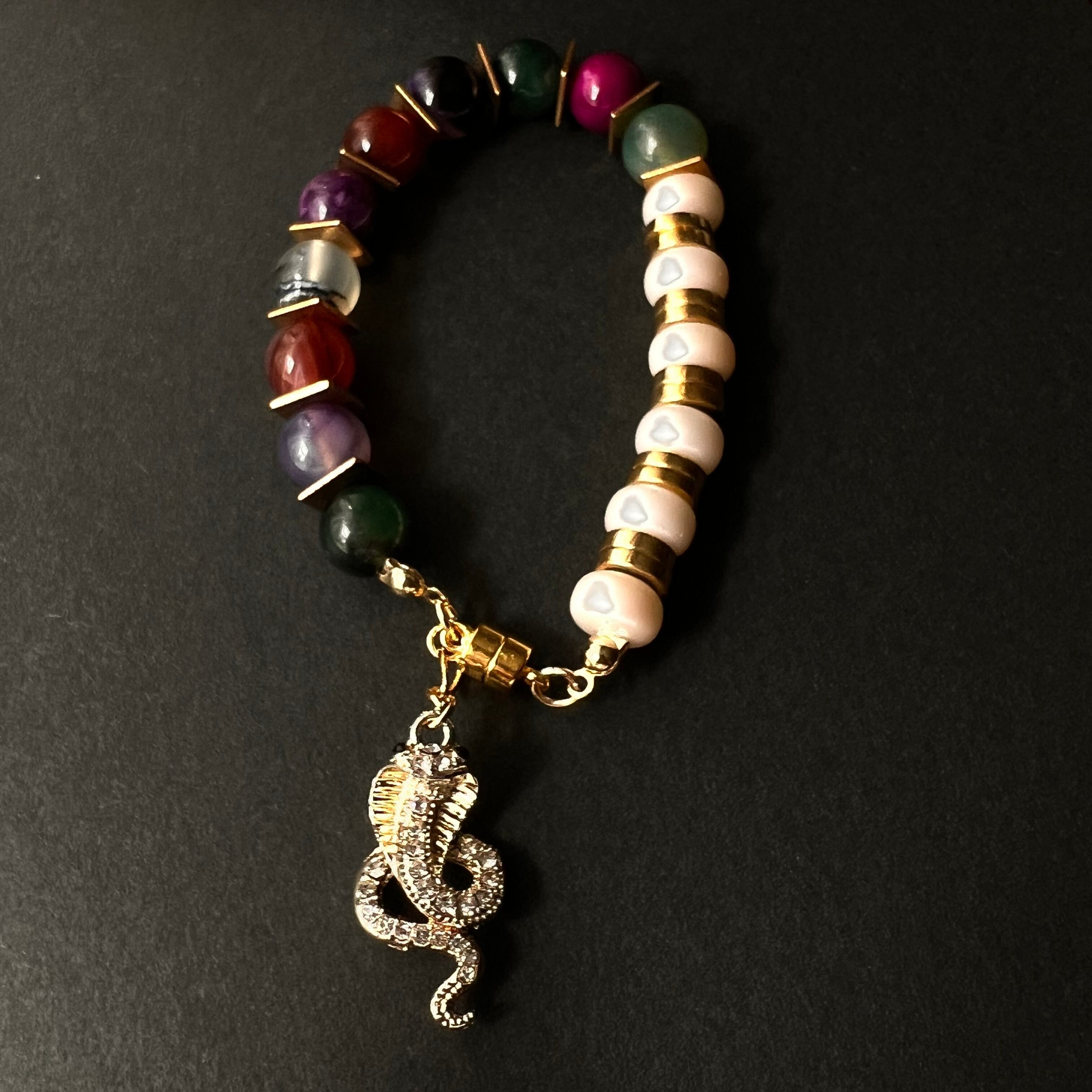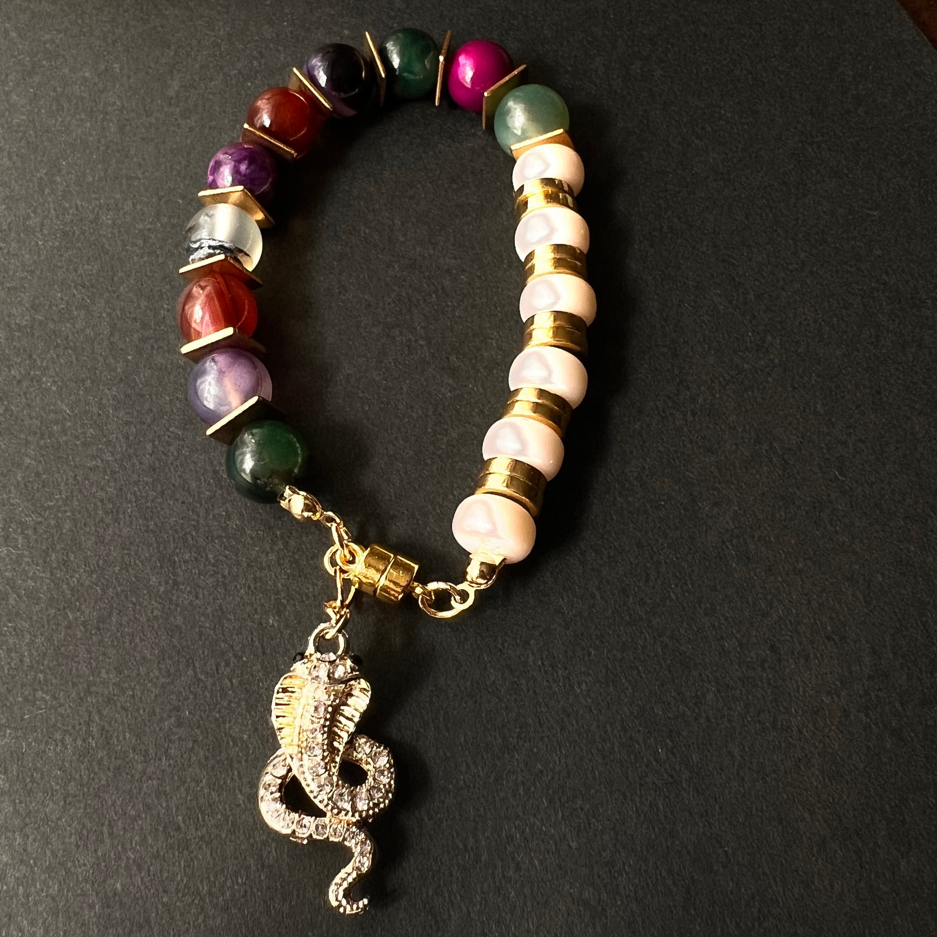 ブレスレット/コブラ circus seriesは、インパクトのあるコブラモチーフが特徴で、あなたの手元に個性を宿します!鮮やかな天然石ビーズが組み合わさり、手首をスタイリッシュに演出し、ファッションに遊び心を添えることができます。デイリースタイルはもちろん、特別な瞬間にも映えるデザインです!
